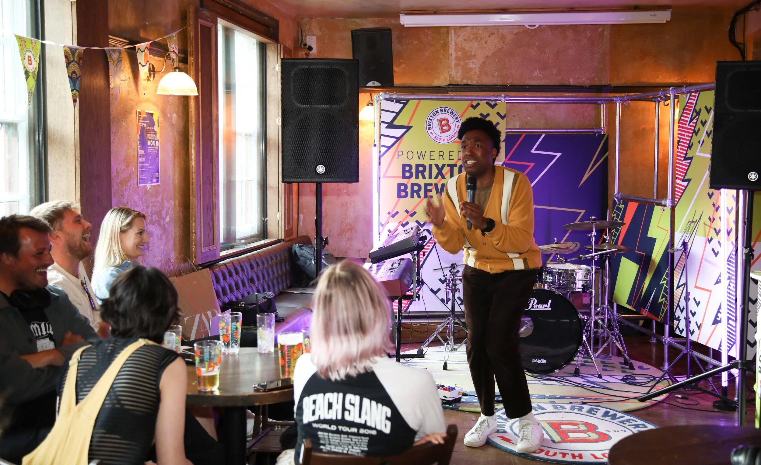 The set for Brixton Brewery's nomadic live event series, Brixton Hour, needed to be portable, scalable, and reusable across multiple activations. Beyond this, the installation needed longevity for future Brixton events, so the graphics had to work for both the specific Brixton Hour identity and the core Brixton brand, requiring minimal changes between uses.